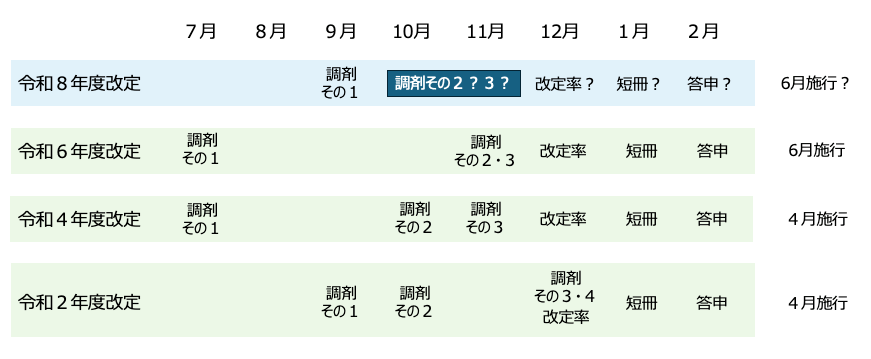 各改定年ごとにスケジュールはまちまちですが、12月までに議論が終わることには変わりありません。